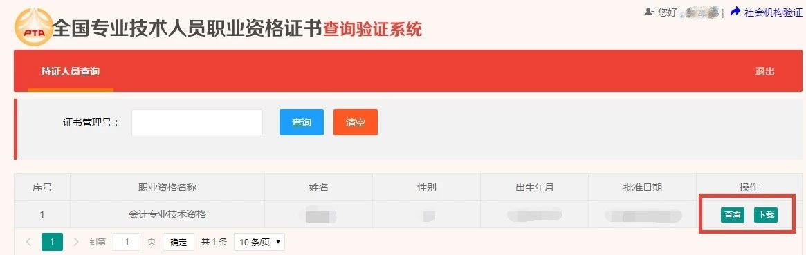 同意服务须知后,进入持证人员查询页面,根据注册信息,查询已开通证书,点击右下角“查看”或“下载”。