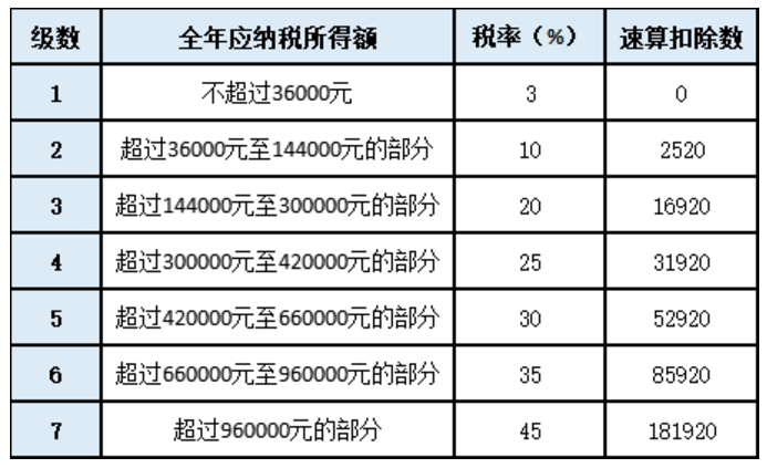 以全年一次性奖金收入除以12个月得到的数额,按照所附按月换算后的综合所得税率表(以下简称月度税率表),确定适用税率和速算扣除数,单独计算纳税。计算公式为: