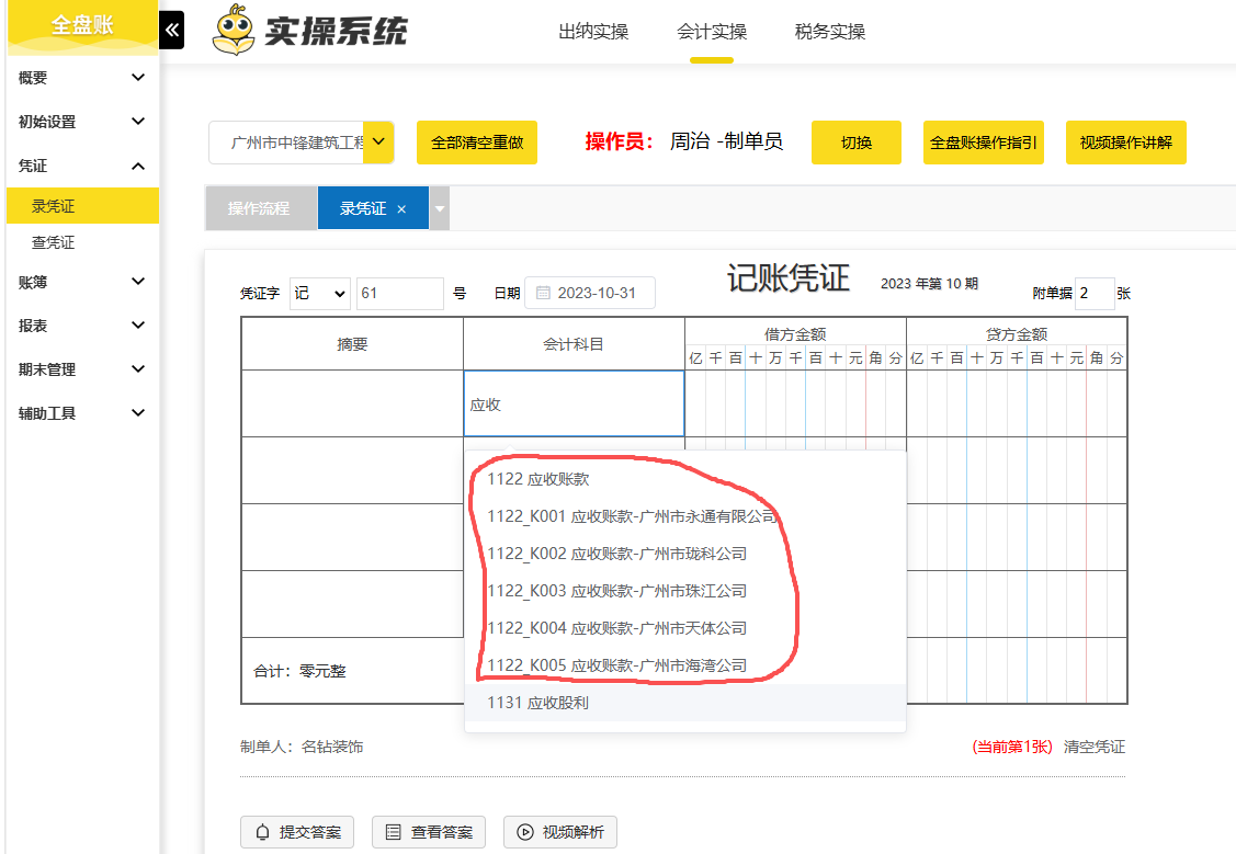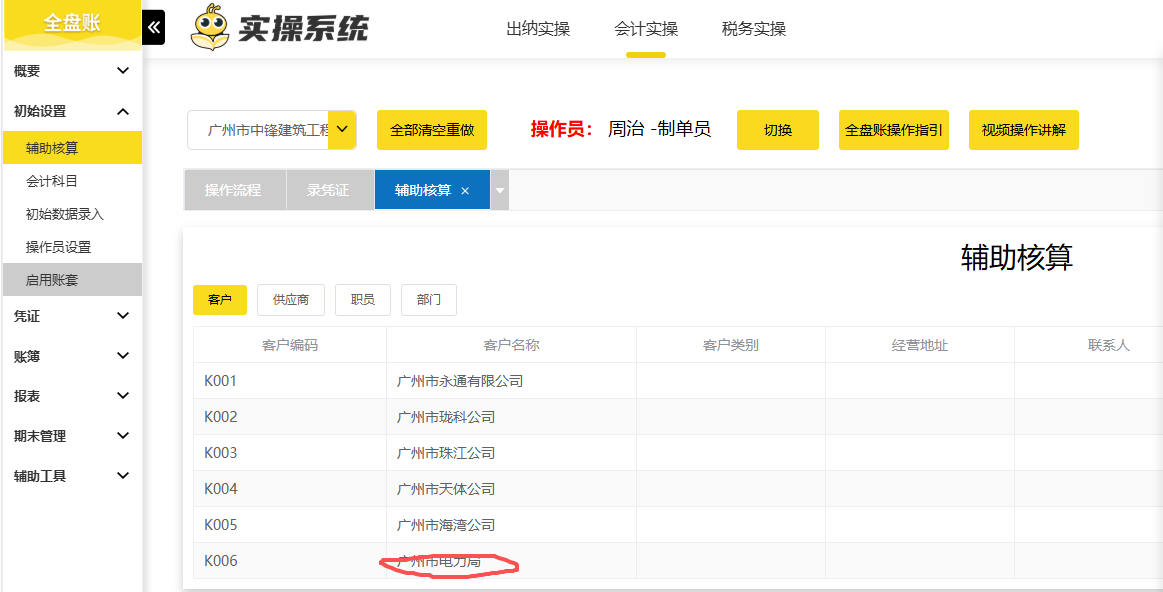 会计实操全盘帐中为什么应收帐款里设置了辅助核算,凭证录入从应收帐款里选却没有广州市电力局呢,导至我61号业务凭证无法做?