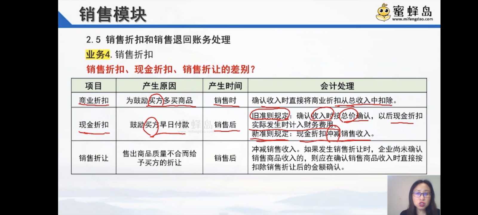 假设销售一批货物不含税售价10000元,增值税1300元,借:应收账款 11300,贷:主营业务收入 10000、应交税费 — 应交增值税(销项税额) 1300,如果客户享受现金折扣200元,则借:银行存款 11100、财务费用200,贷:应收账款11300,销售折让可以直接按折后金额做分录,借:应收账款,贷:主营业务收入、应交税费 — 应交增值税(销项税额)