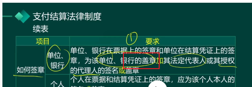 单位、银行在票据和结算凭证上的签章,为该单位、银行的盖章加其法定代表人或者其授权的代理人的签名或者盖章。个人在票据和结算凭证上的签章,为个人本人的签名或盖章。